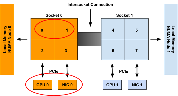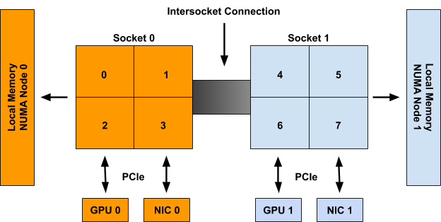 For example, in Figure 1, CPUs 0-3 are said to be part of NUMA node 0, whereas CPUs 4-7 are part of NUMA node 1. Likewise GPU 0 and NIC 0 are said to be part of NUMA node 0 because they are attached to Socket 0, whose CPUs are all part of NUMA node 0. The same is true for GPU 1 and NIC 1 on NUMA node 1.